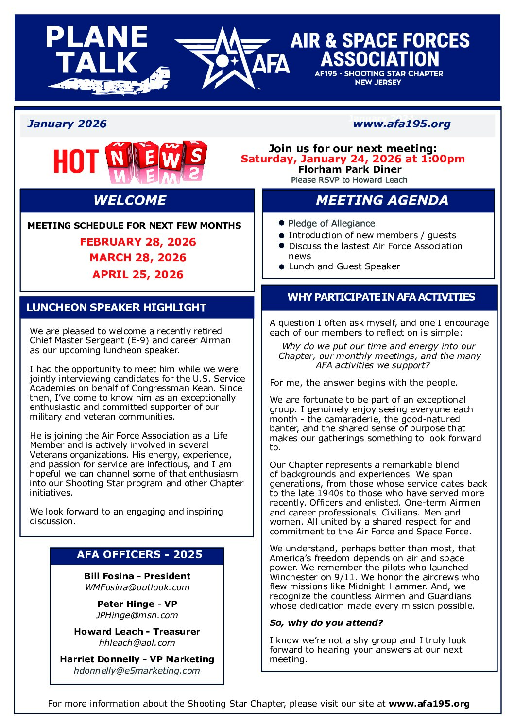 The Shooting Star Chapter, AF195, of the Air & Space Forces Association normally meets on the last Saturday of the month from January to May and September and October with the meetings currently being held at 1:00 PM in the Florham Park Diner, 182 Ridgedale Ave., Florham Park, NJ.