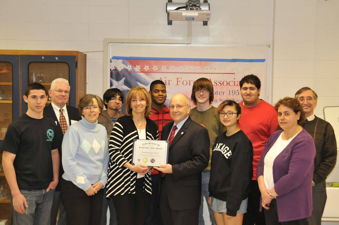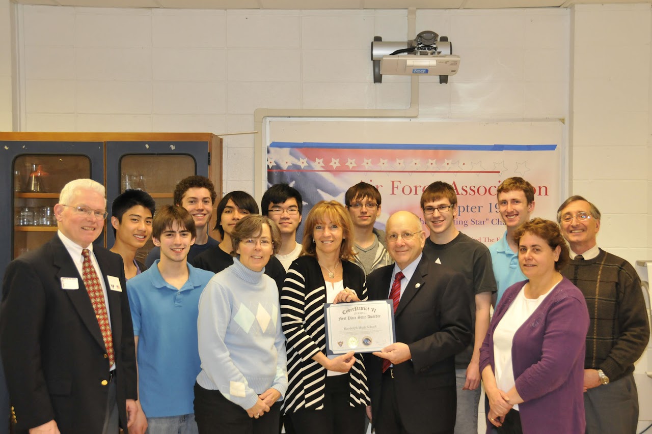 The Randolph High School Air Force Association CyberPatriot VI Open Division first team was recently recognized for their first place finish within New Jersey. Above, the CyberPatriot-VI 2013-14 First Place certificate was presented by William Fosina, President, Chapter 195, to Debbie Iosso, Principal, with Howard Leach, NJ AFA President and Coach Sally Snelson on left, and Assistant Coach Roslyn Franklin and STEM Supervisor Michael Casicone on right. The first place team members are shown in the back except for Patrick May who was not available for the photo.