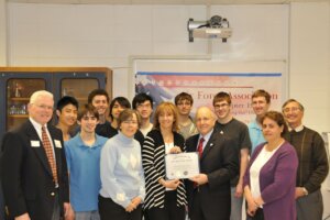 The Randolph High School Air Force Association CyberPatriot VI Open Division Blue team was recently recognized for their second place finish within New Jersey. Above, the CyberPatriot-VI 2013-14 Second Place certificate was presented by William Fosina, President, Chapter 195, to Debbie Iosso, Principal, with Howard Leach, NJ AFA President and Coach Sally Snelson on left, and Assistant Coach Roslyn Franklin and STEM Supervisor Michael Casicone on right. The Second Place team members are shown left to right except for Kevin Leary who was not available for the photo.